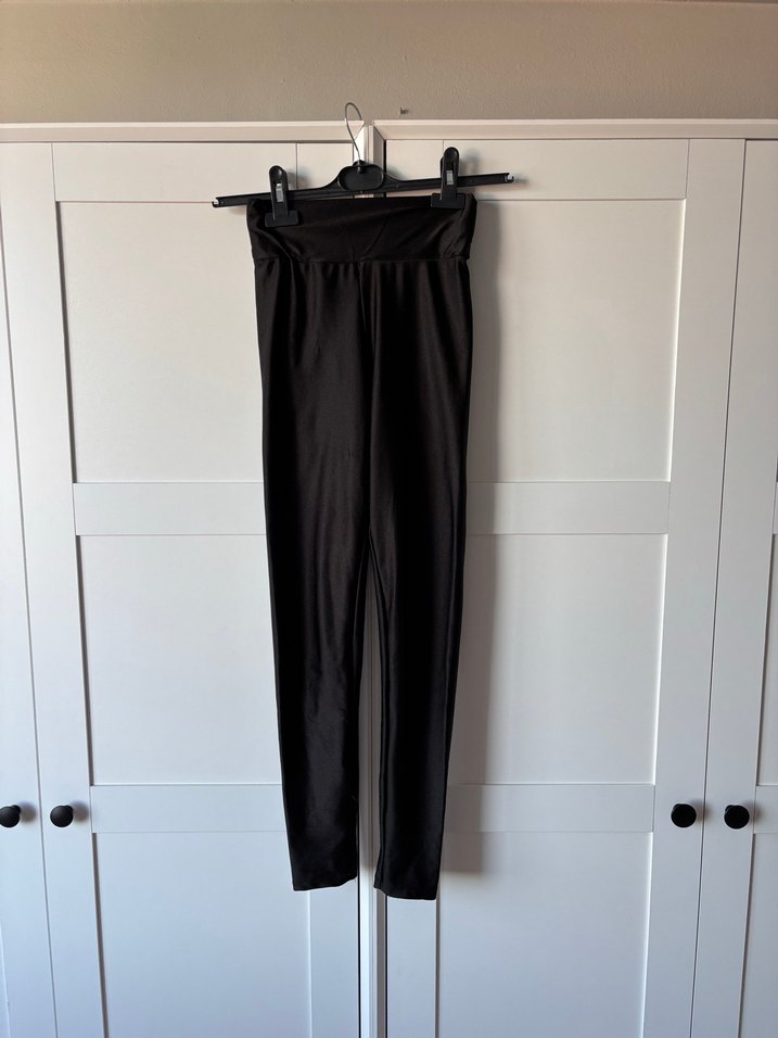 Yumuşak parlak kumaştan,yüksek bel , düz tasarımlı siyah, vücuda oturan kadın taytı, günlük kullanıma uygun. M beden yazıyor etikette ancak s olur.