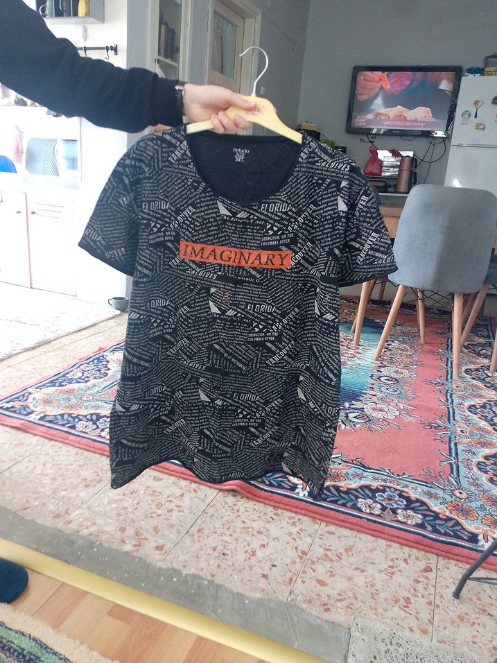 Siyah, kısa kollu, tişört. Bol kesim ve yuvarlak yaka ile rahat bir kullanım sunar. Turuncu "IMAGINARY" yazısı detaylıdır.