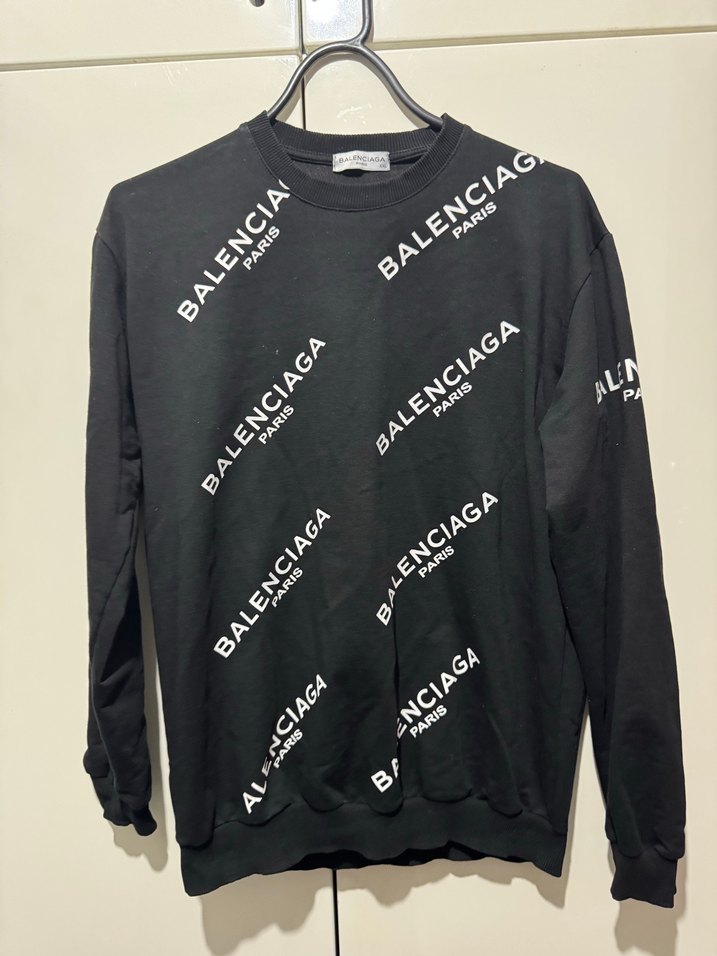 Siyah baskılı Balenciaga sweatshirt, uzun kollu ve yuvarlak yaka, bol kesim ve sentetik kumaştan üretilmiştir. Günlük sokak stili için uygundur.