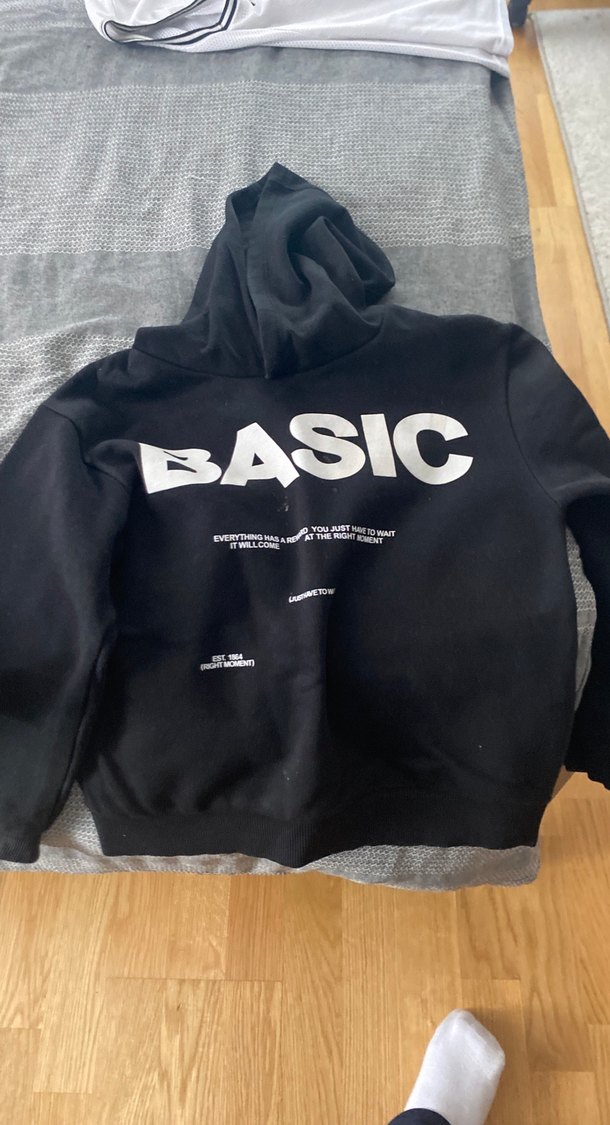 Siyah, uzun kollu, baskılı 'BASIC' yazılı sweatshirt, rahat kesim ve yuvarlak yakaya sahip. Yumuşak ve sıcak kumaştan üretilmiştir. Minimalist sokak tarzına uygun.