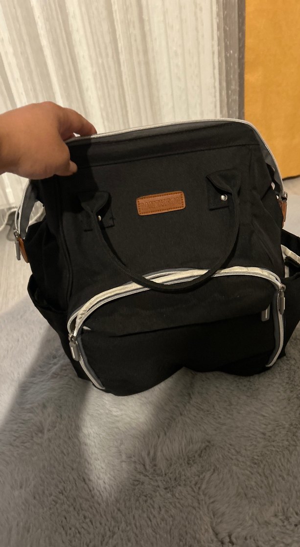 Siyah baskılı bebek bakım çantası, birden fazla bölmeli ve sağlam saplı, düzenli kullanım sağlar.
