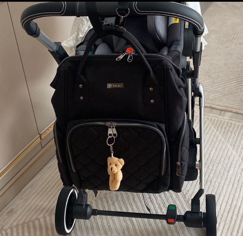 Çok bölmeli siyah baskılı bebek çantası, küçük ayıcık süsü ile birlikte