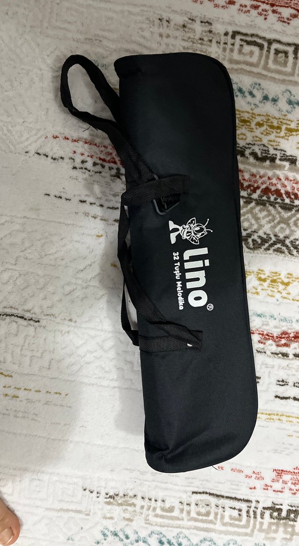 Siyah renkli, baskılı 'lino' logosu bulunan bebek çantası, kullanışlı ve kompakt bir saklama çözümü sunar.