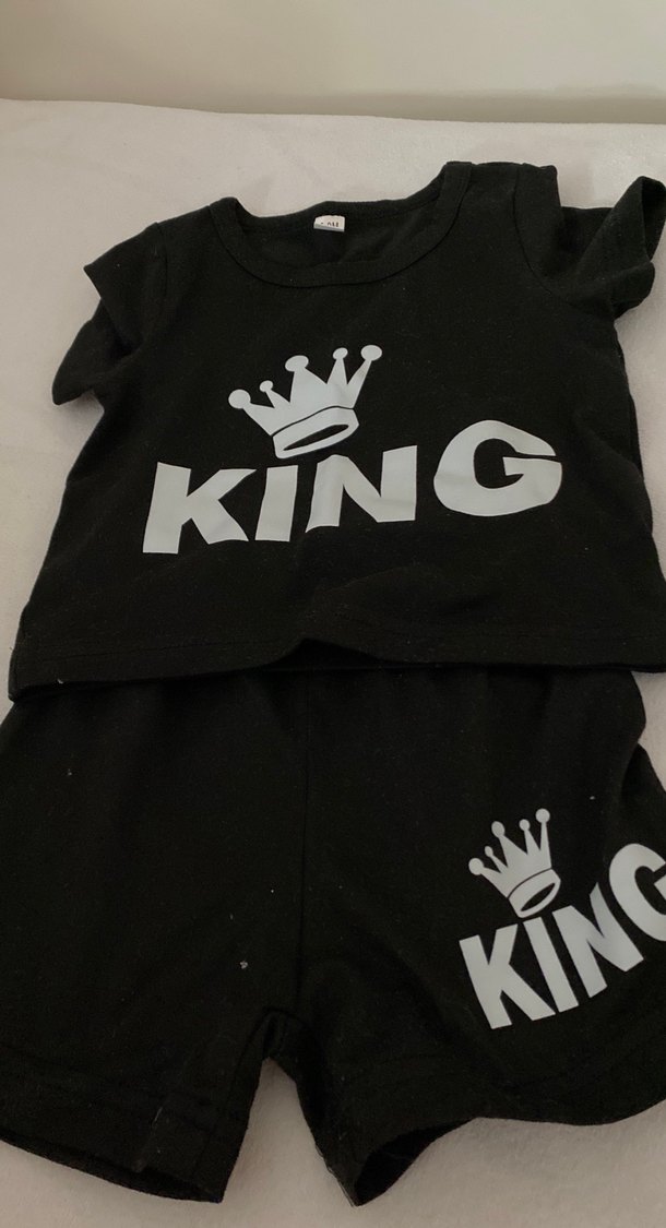 Siyah kısa kollu üst ve şorttan oluşan bebek erkek takımı, "KING" baskısı ve taç deseni içerir. Yumuşak sentetik kumaştan, yuvarlak yaka.