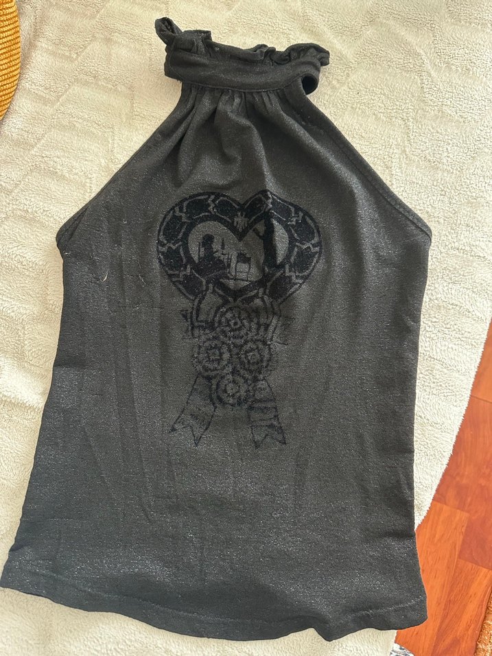Boğazlı, kolsuz, baskılı gotik desene sahip siyah hamile bluzu. Belinde tokalı detay bulunur, günlük kullanıma uygundur.