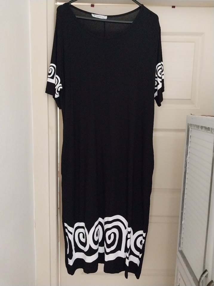 Siyah uzun kol ve etek ucu baskılı detaylara sahiptir. Minimalist gotik tarzına uygundur. omuzdan boy118 cm göğüs 110 cm esnek viskon rahat kumaştır