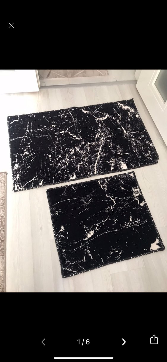 İki parçalı siyah baskılı çağdaş halı seti. Koyu renk ve soyut desen modern bir görünüm sunar. Bir defa yıkandı#banyopaspası #paspastalımı