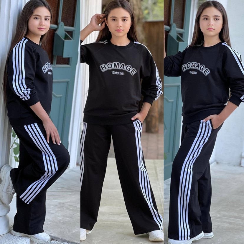Yumuşak kumaştan, uzun kollu ve bisiklet yaka siyah eşofman takımı, yanlarda beyaz çizgiler ve 'HOMAG' baskılı, günlük kullanıma uygun.