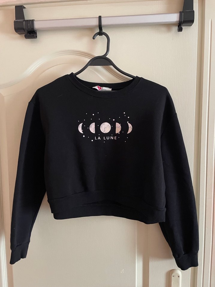 Siyah renkli, baskılı ay evreleri ve "LALUNE" yazılı, yuvarlak yaka ve uzun kollu, rahat kesim kadın sweatshirtü. Yumuşak ve sıcak kumaştan, günlük kullanıma uygun.