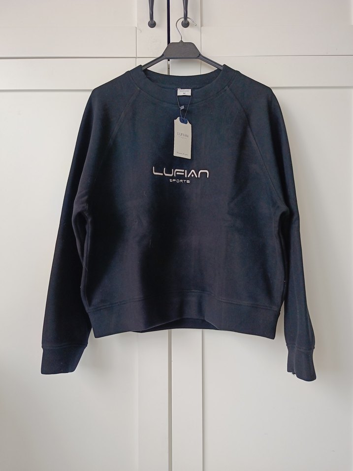Siyah baskılı denim sweatshirt, yuvarlak yakalı ve uzun kollu, bol kesim. LUEIAN baskılı, günlük kullanıma uygun rahat stil sunar.