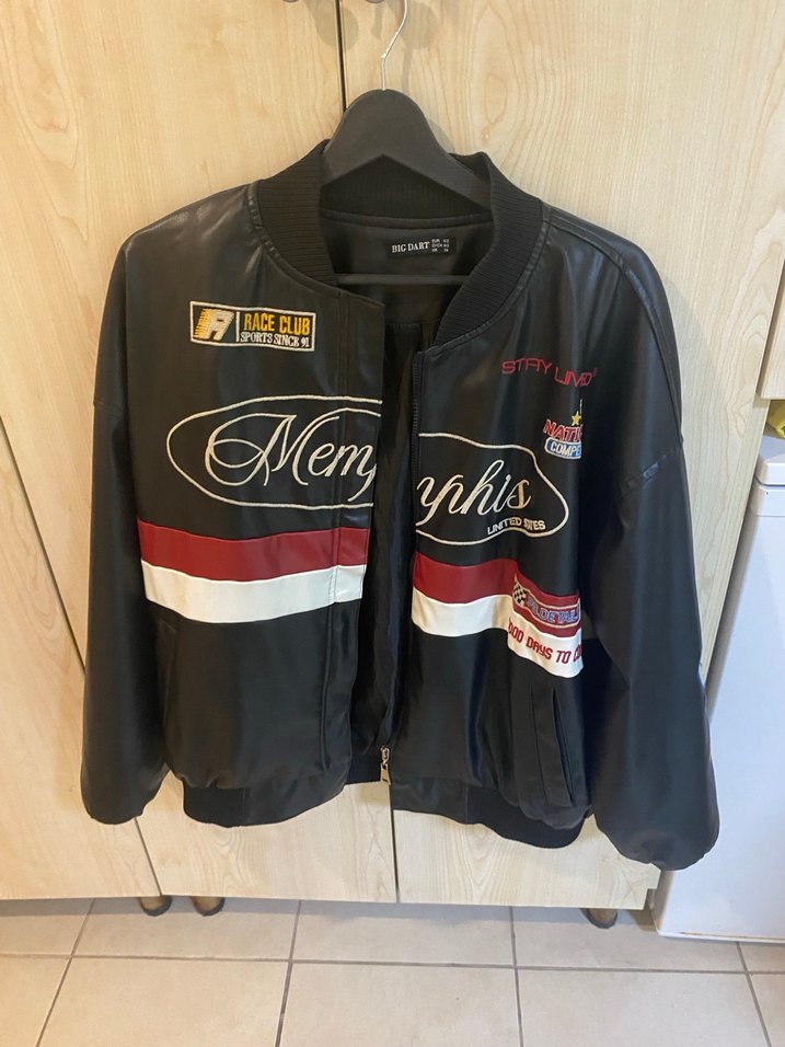 Siyah deri biker ceket, uzun kollu ve bisiklet yaka. Bol kesim, fermuarlı, baskılı desenli ve midi boyda. Günlük kullanım için uygun.