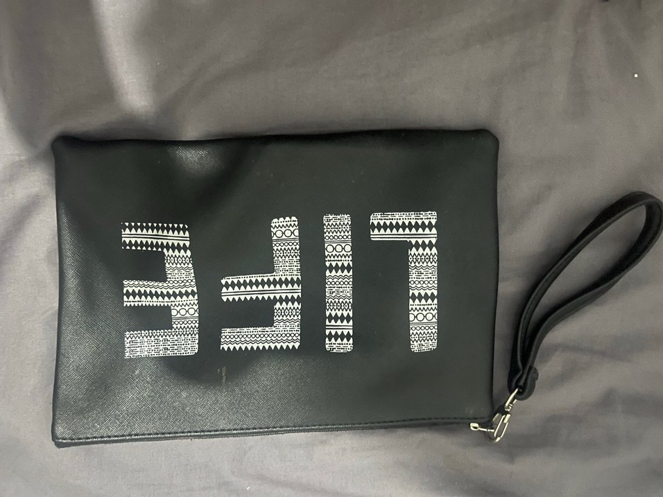 Siyah deri, baskılı ve fermuarlı kadın portföy çanta, günlük kullanıma uygun sokak tarzı koyu renklidir.
