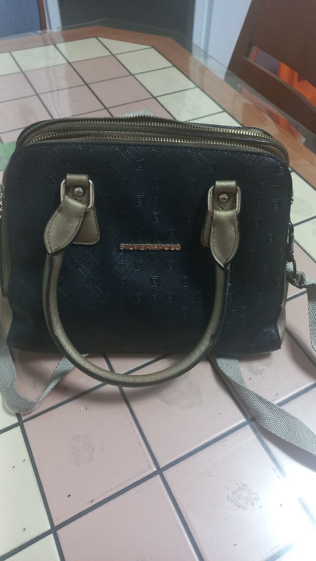 Siyah deri, baskılı desenli ve tokalı saplara sahip kadın çantası. Günlük kullanım için Paris tarzı ve çağdaş tasarım sunar. içinde 3 bölme ve ayrıca küçük gözleri var.