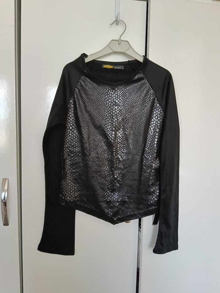Siyah uzun kollu, yuvarlak yaka ve yılan desenli deri görünümlü bluz, ön kısmı v şeklinde ,sentetik kumaştan günlük kullanıma uygun. Ölçüler bel 40 koltuk altı 47 uzunluk 50