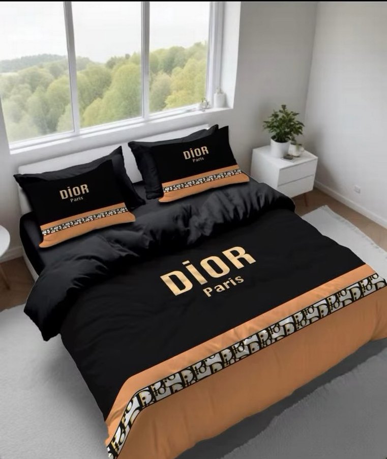 Siyah ve bej renklerde, Dior Paris baskılı desenlere sahip nevresim takımı. ️