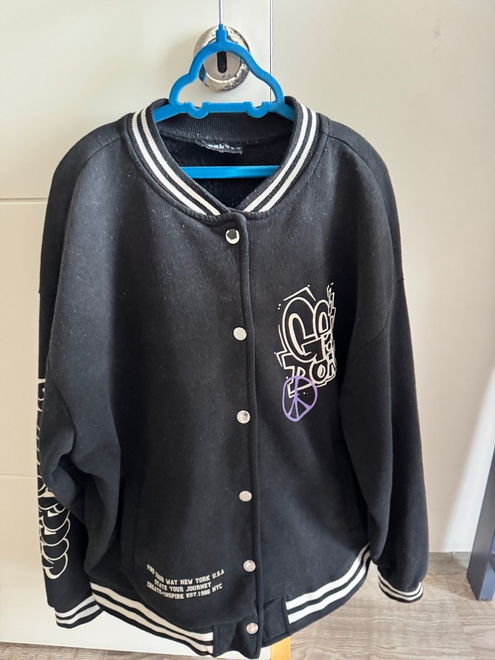 Düğmeli, baskılı detaylı siyah kadın ceketi. Uzun kollu, bisiklet yaka ve normal midi boyda, yumuşak kumaştan üretilmiştir.