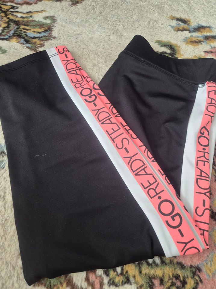 Sentetik kumaştan spor ve sokak stili için elastik bel bantlı, siyah renkli, gri ve canlı pembe baskılı yan şeritlere sahip dar kesim tayt. uzunluk.70 cm