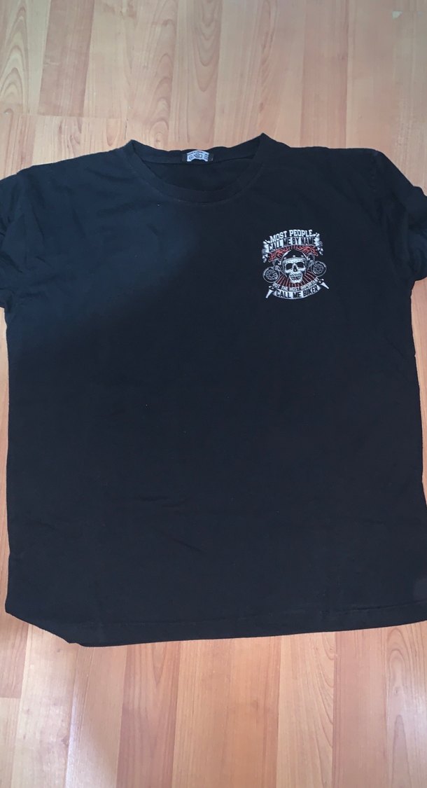 Siyah baskılı erkek biker tişörtü, bisiklet yaka ve kısa kolludur. Denim kumaştan, bol kesim ve normal boyda, rock punk tarzını yansıtır.
