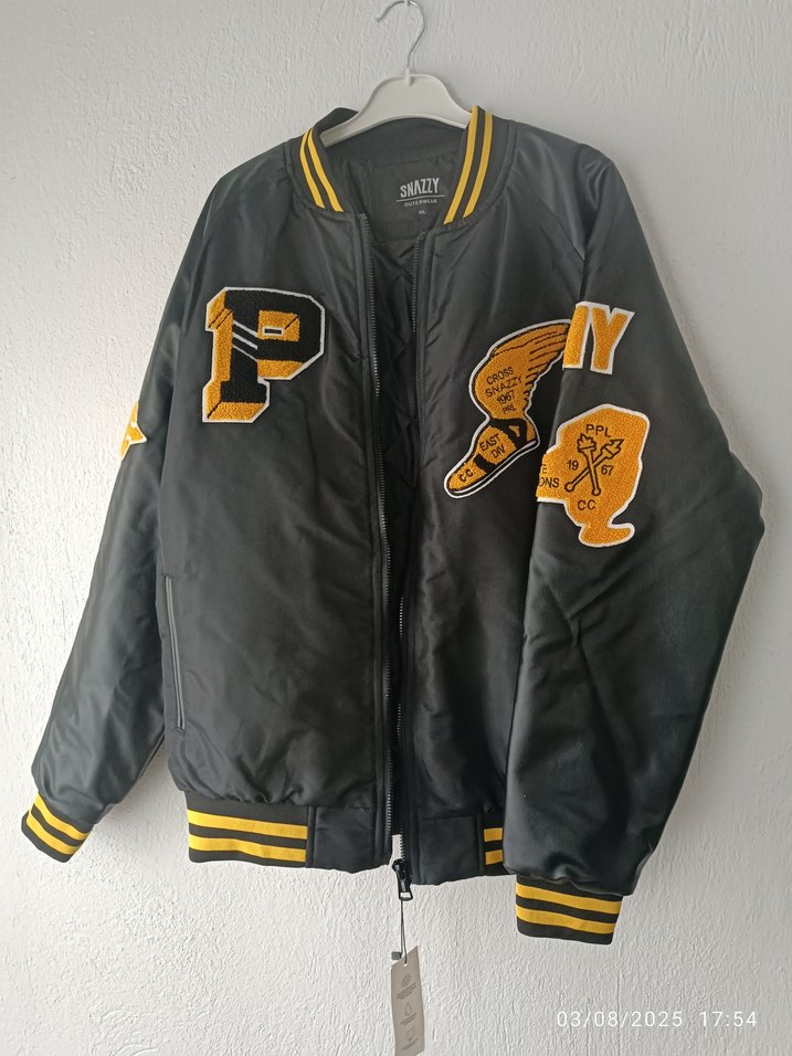 Siyah suni deri görünümlü baskılı, uzun kollu, fermuarlı erkek bomber ceket. ici elyaf dolgu ekose dikişli bol kesim, sarı çizgili ribana detaylı. Spor ve gündelik kullanıma uygun.