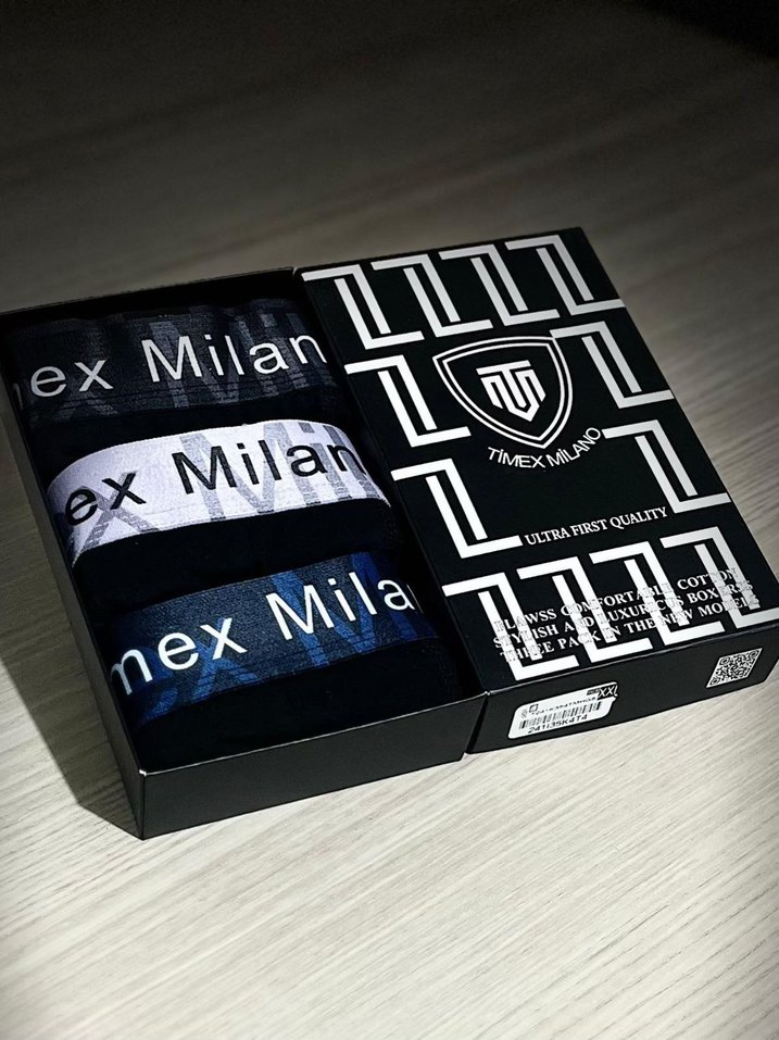 Koyu siyah renkli, baskılı ve dar kesim kısa boy erkek boxer seti. Bel kısmında 'ex Milan' yazısı bulunan sokak stili tasarım.