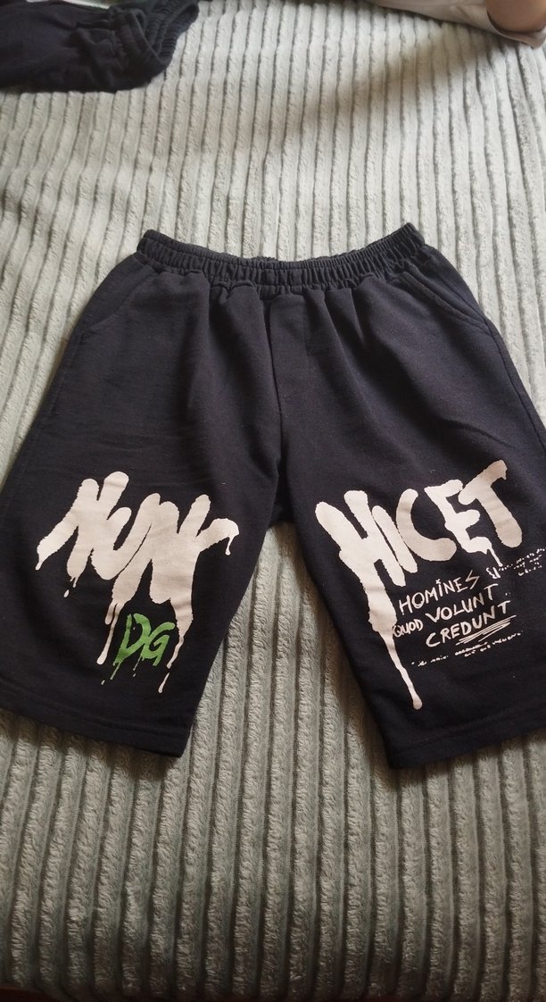 Siyah pamuklu, bol kesim baskılı şort. Elastik bel bandı ve dikkat çekici grafik yazılarla rahat ve şık bir tarz sunar.