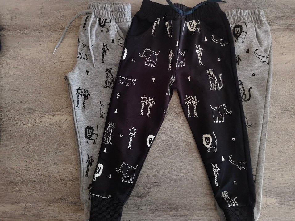 Gri ve siyah renklerde, baskılı hayvan ve ağaç desenli, bol kesim erkek çocuk eşofman altı. Yumuşak pamuk kumaş ve örme manşetler içerir.