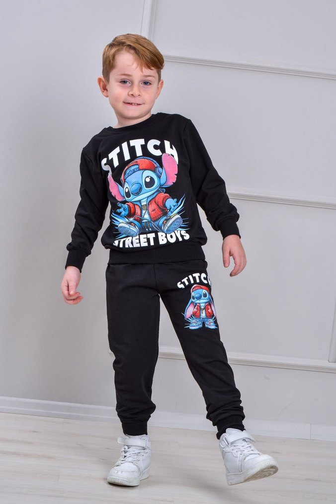 2 iplik şardonsuz mevsimlik Pamuklu siyah eşofman takımı, bol kesim ve baskılı Stitch deseni ile. Bisiklet yaka ve örme detaylara sahip, trend sokak tarzı için uygun.