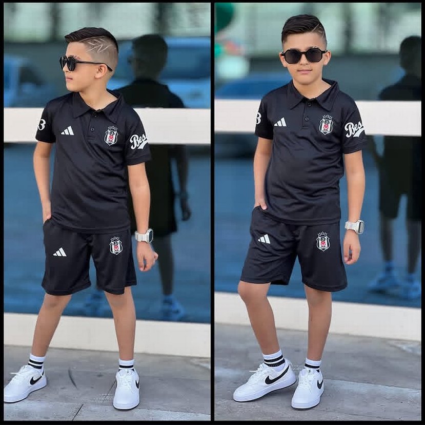 Pamuk kumaştan üretilmiş, baskılı ve bol kesim siyah erkek çocuk eşofman takımı. Polo yaka üst ve şort ile rahat sokak stili sunar. 'Be' yazılı detaylar şıklık katıyor.