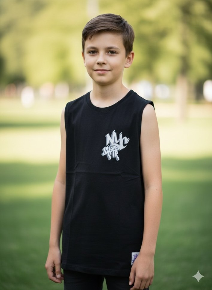 Siyah Baskılı Erkek Çocuk Kolsuz Tişört