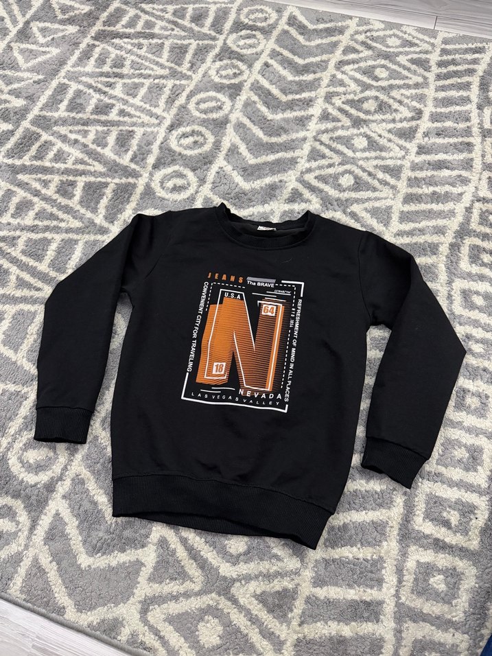 Siyah renkli, uzun kollu, bisiklet yaka ve bol kesim erkek çocuk sweatshirtü. Ön kısmında baskılı desen bulunur, yumuşak ve sıcak kumaştan üretilmiştir.