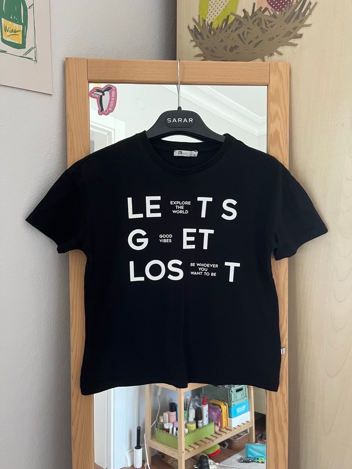 Siyah pamuklu, kısa kollu, oversize kesim erkek çocuk tişörtü. Önünde "LETS GET LOST" baskısı bulunan rahat sokak stili. Bir sorunu yok az kullanıldı #ltb #ltbtişört #tişört #erkekçocuk #çocuktişört
