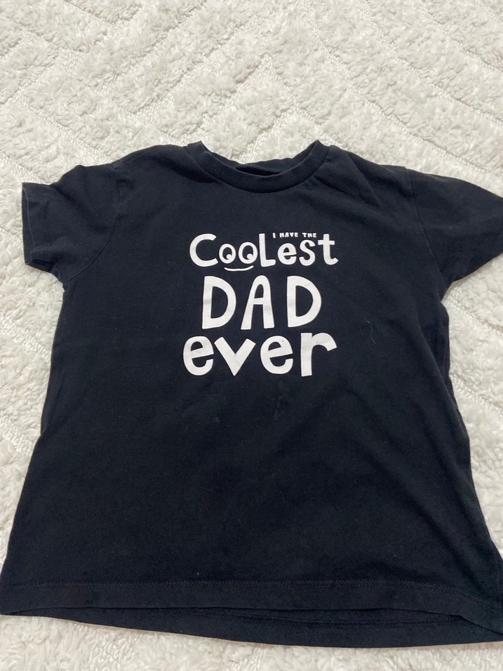 Siyah renkli, pamuklu, kısa kollu, yuvarlak yaka ve bol kesim erkek çocuk tişörtü. "Coolest Dad Ever" baskılı, rahat sokak stili.