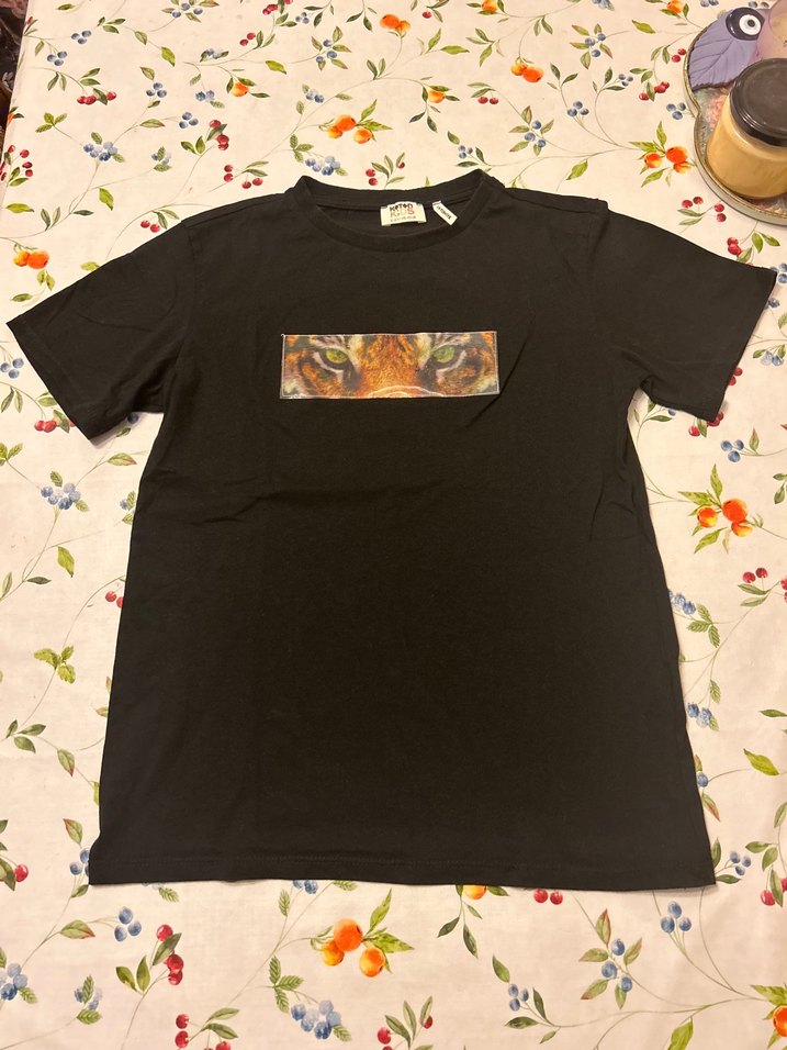 Siyah renk, kısa kollu, yuvarlak yaka erkek çocuk tişörtü. Önünde baskılı kaplan gözleri deseni bulunur. Temiz kullanıldı