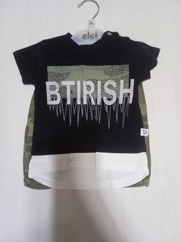 Siyah, pamuklu, kısa kollu ve yuvarlak yakalı erkek çocuk tişörtü. Baskılı 'BTIRISH' deseniyle rahat ve salaş kesim sunar.