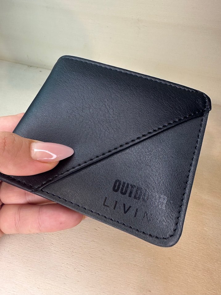 Siyah renkte, baskılı desene sahip, sade ve temel tarzda erkek cüzdanı. Üzerinde 'LIVING' ve 'OUTDOOR Yazıları bulunur.