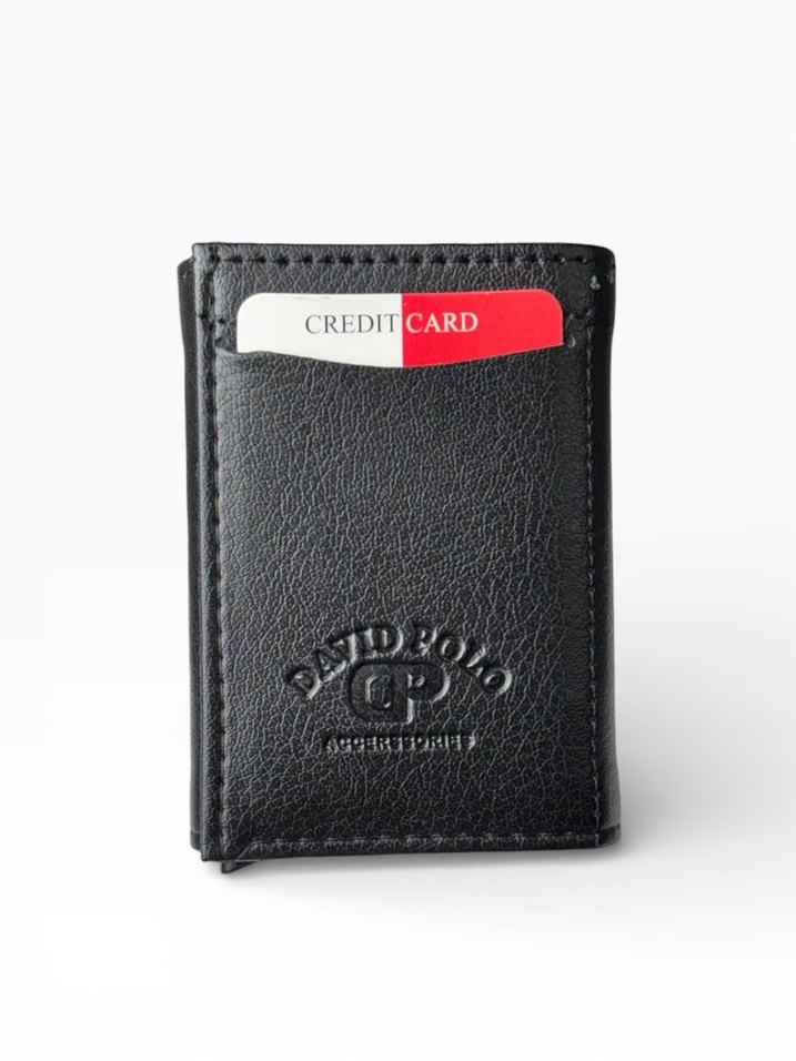 Siyah baskılı erkek cüzdanı, kredi kartı için bölmeli ve dokulu yüzeye sahip. Biker stilinde, kabartma logo bulunur.