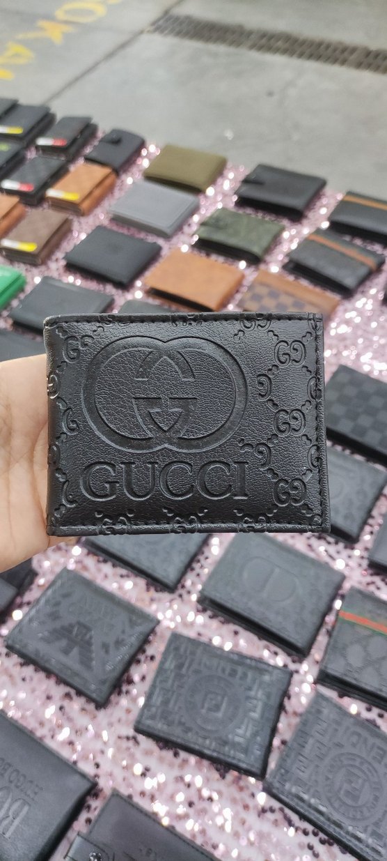 Önünde kabartmalı GUCCI logosu bulunan siyah baskılı erkek cüzdanı. Koyu tonlarda, gösterişli ve sokak modası tarzında.