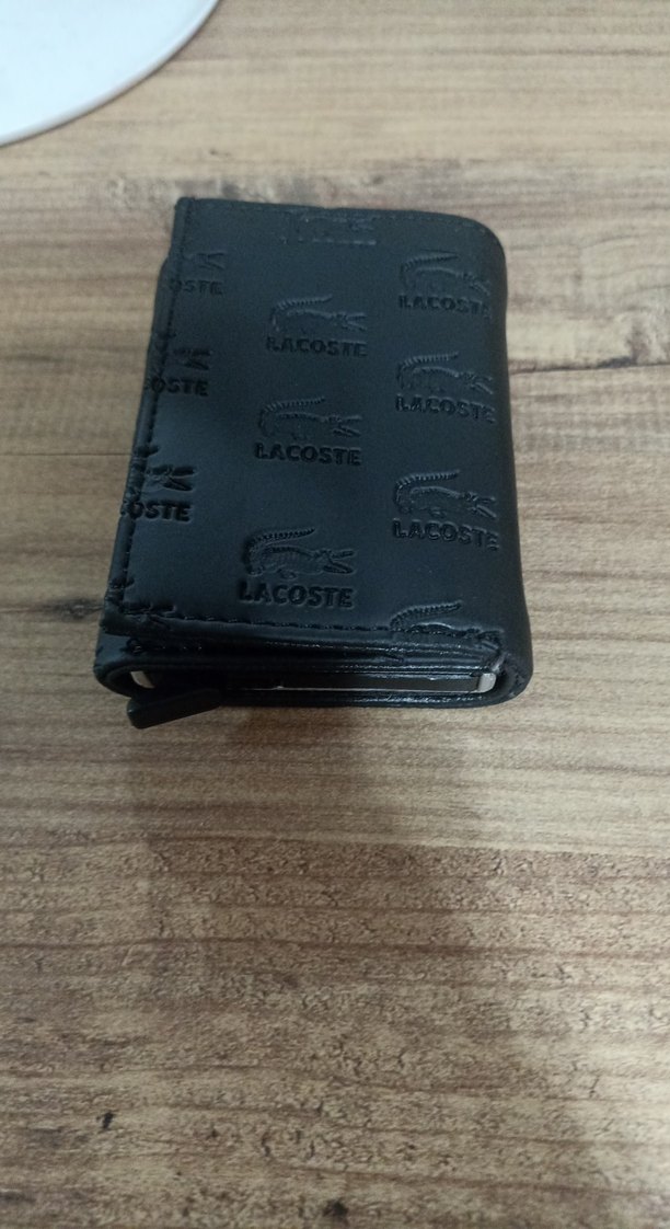 Siyah renkte, LACOSTE marka baskılı erkek cüzdanı. Sokak giyimi stiline uygun, koyu tonlarda, Paris etkisinde.