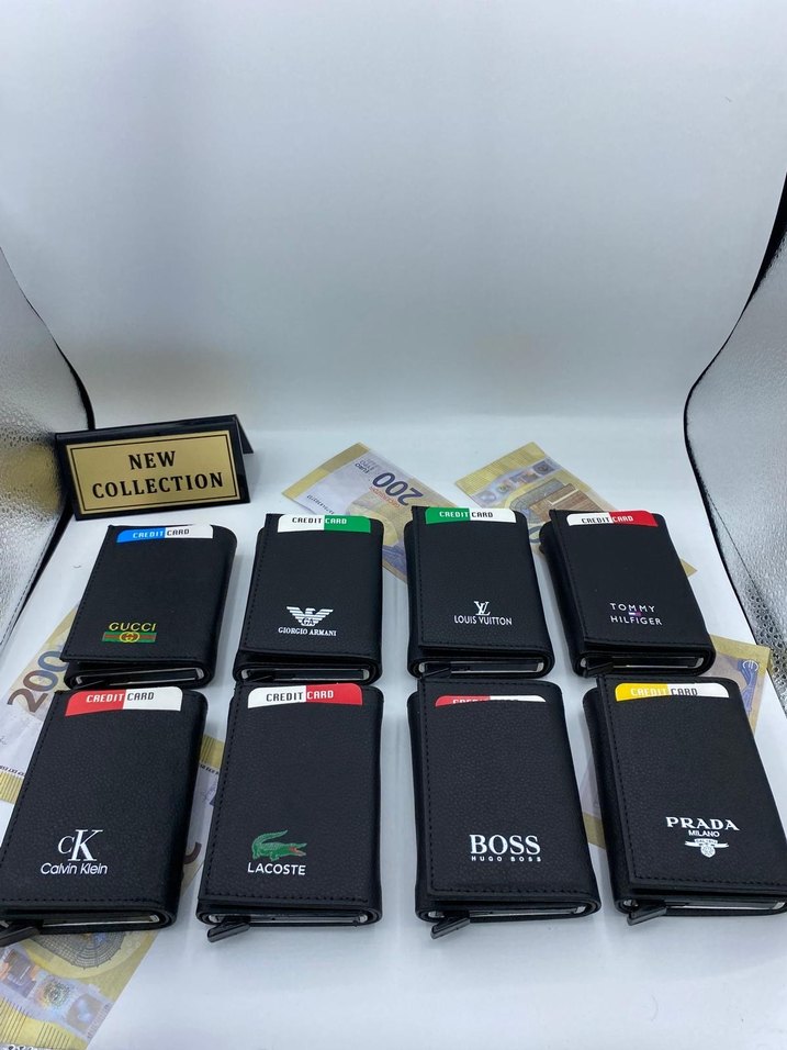 Gucci, Armani, Louis Vuitton, Tommy Hilfiger, Calvin Klein, Lacoste, Boss ve Prada baskılı siyah erkek cüzdanları. Trendy casual sokak stiline uygun, çoklu kart bölmeli cüzdanlar.