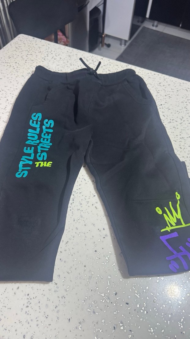 Sentetik kumaştan, fermuarlı cepli, renkli baskılı yazılı, siyah renkli bol kesim erkek eşofman altı, spor için uygun.