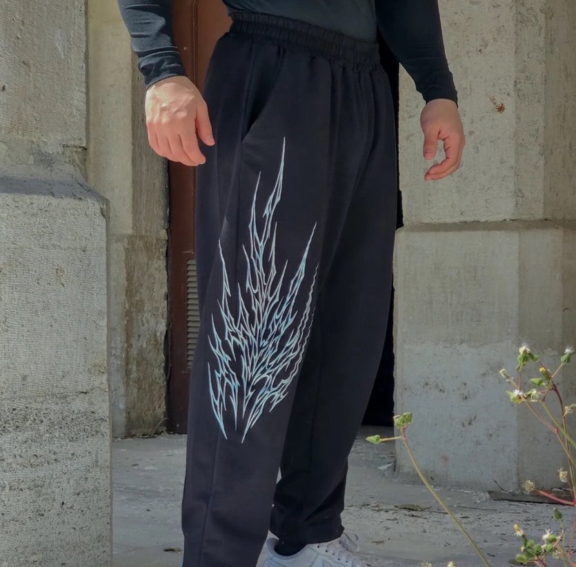 Sentetik kumaştan, yan yırtmaçlı, baskılı siyah bol kesim erkek eşofman altı, günlük rahat kullanım için uygundur.