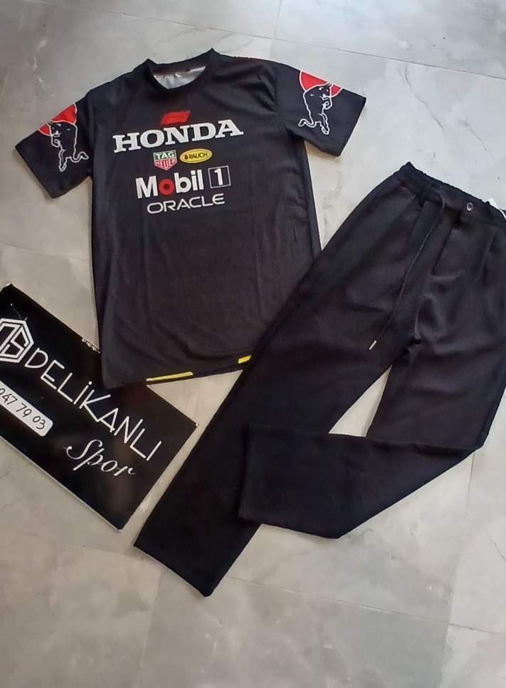 Siyah baskılı, kısa kollu, bisiklet yaka üst ve rahat kesim pantolonlu erkek pijama takımı. HONDA, ORACLE ve Mobil 1 gibi logolar içerir. S BEDEN MEVCUTTUR
