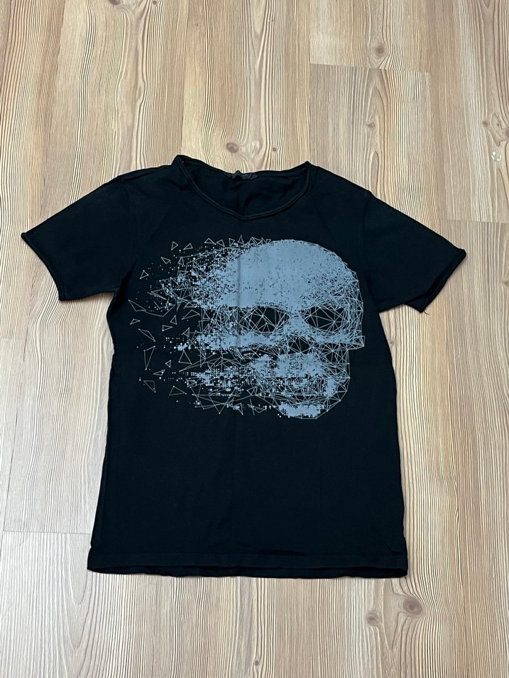 Pamuk siyah tişört, bol kesim ve bisiklet yaka. Kısa kollu, normal boyda ve büyük baskılı kafatası deseniyle günlük kullanım için uygun.