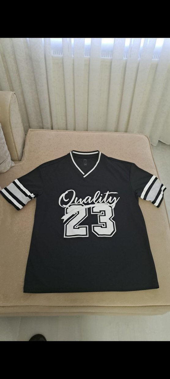 Pamuk siyah tişört, kısa kollu ve yuvarlak yaka. "Quality 23" baskısı ve kollarda dantel detaylarıyla rahat sokak stili için uygundur.