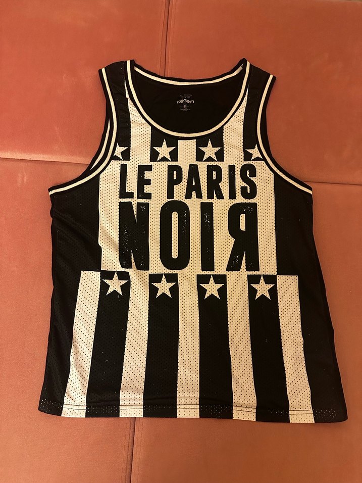 Dar kesim siyah kolsuz spor tişört, bisiklet yaka ve "LE PARIS" baskılı desenle sokak stili ve rock punk havası sunar önü forma kumaşı arkası tişört kumaşı ürün temiz sorunsuz