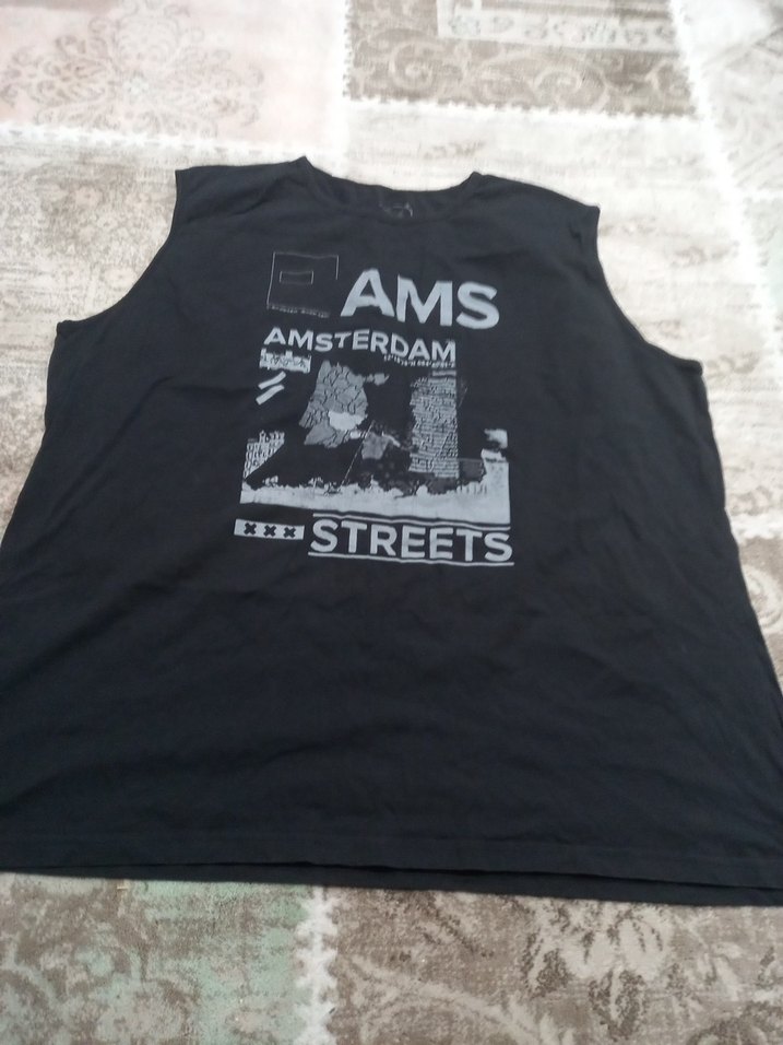 Siyah kolsuz, bol kesim erkek tişörtü, AMS, Amsterdam ve Streets baskılı, spor ve sokak tarzı için uygun. ️6 xl
