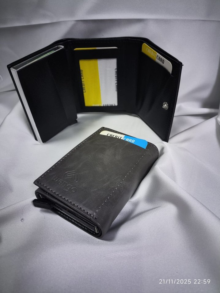 Gri detaylı siyah baskılı erkek cüzdanı, kart bölmeleri ve güvenli çıtçıt kapama içerir.