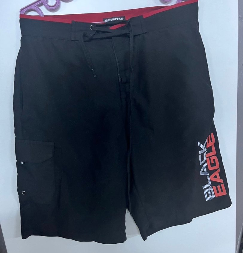 Siyah, baskılı ve kemerli erkek yüzme şortu, rahat ve bol kesim. Midi boy, plaj ve günlük kullanım için uygun. ️