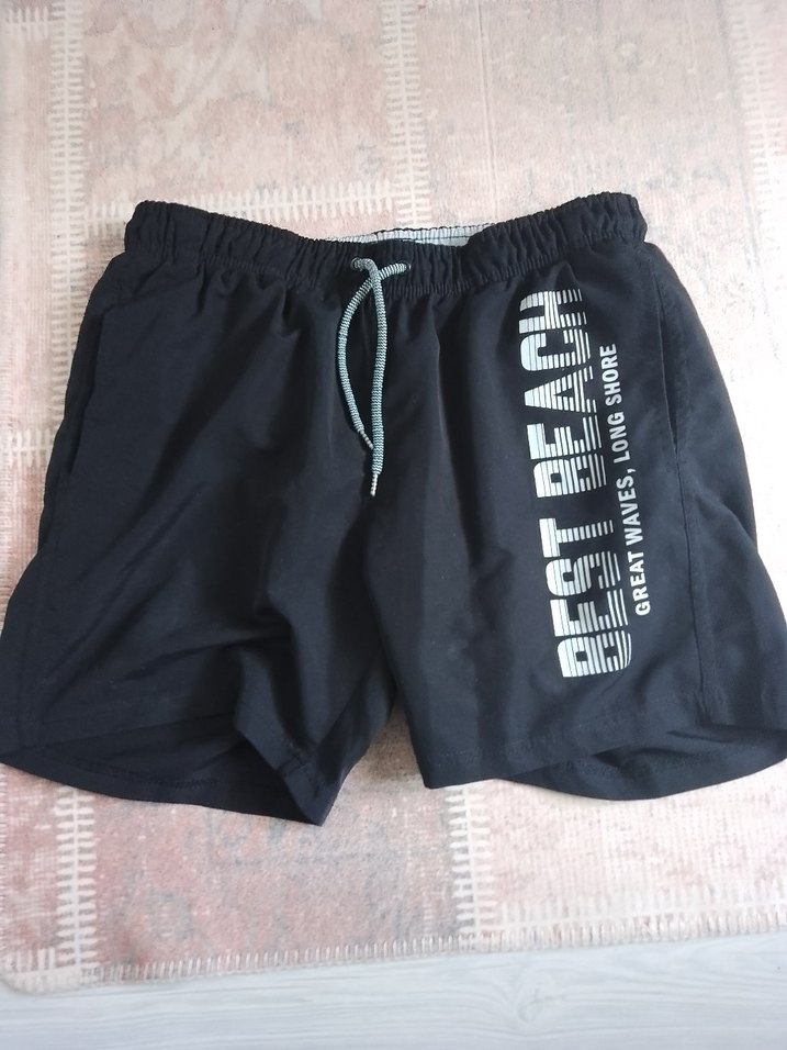 Siyah renkte, bol kesim ve elastik bel bantlı erkek mini yüzme şortu. Yan tarafında 'Best Beach' baskılı yazı bulunur, plaj ve sokak stiline uygundur. ️