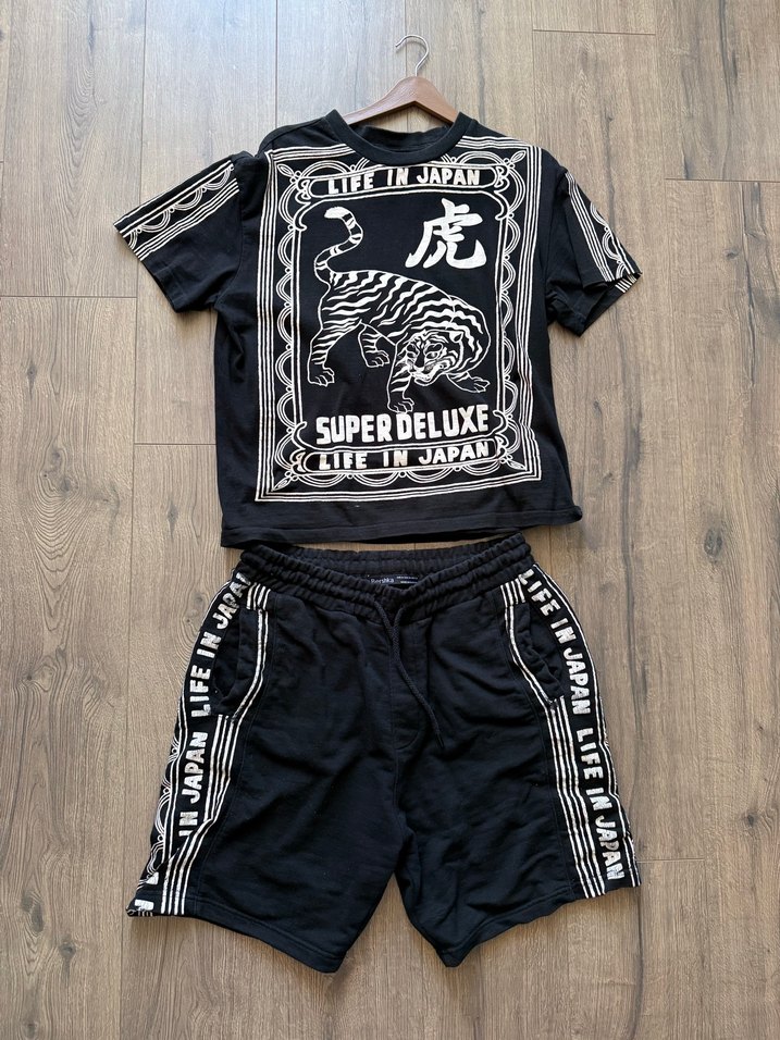 Siyah mini pijama takımı, bol kesim kısa kollu ve bisiklet yakalıdır. Üzerinde kaplan baskısı ve "SUPER DELUXE" yazısı bulunur. Yanları çizgili, kemerli şort ile tamamlanır.